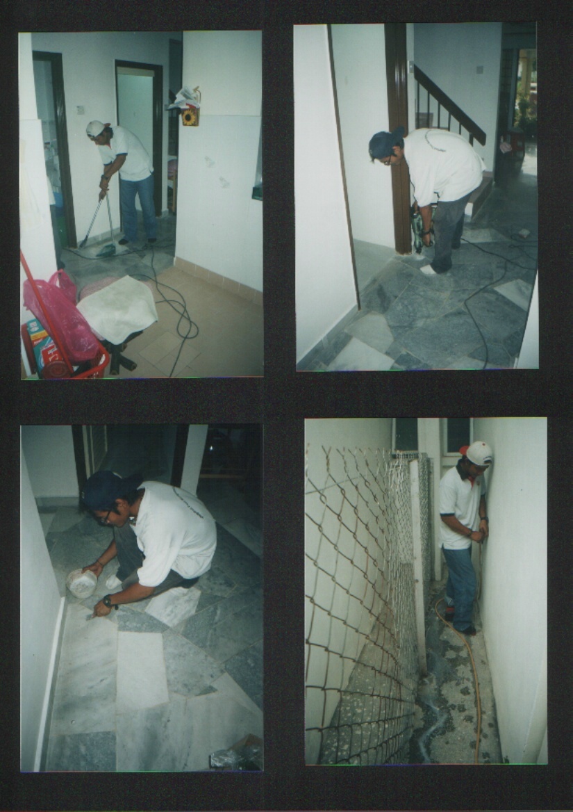The various stages of corrective slab injection treatment. From right to left, top hand right corner a technician drilling into the floor slab. On the top left hand corner, another technician clear the dusts. On the right bottom corner, a technician using a power sprayer hose to fill the hole with chemical. On the left hand bottom corner, a technician sealing up the hole. Note that the hole is hardly visible in this close up photo.