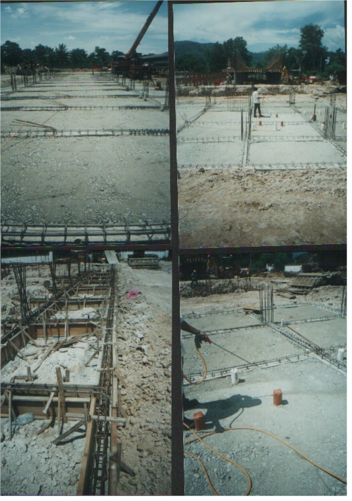 a. Application of termiticide mixtures unto the soil bed prior to receiving of lean concrete for construction of footings. Alternatively, impregnation by drenching the 40mm soil border around the ground beams and stump columns, if the above is delayed.